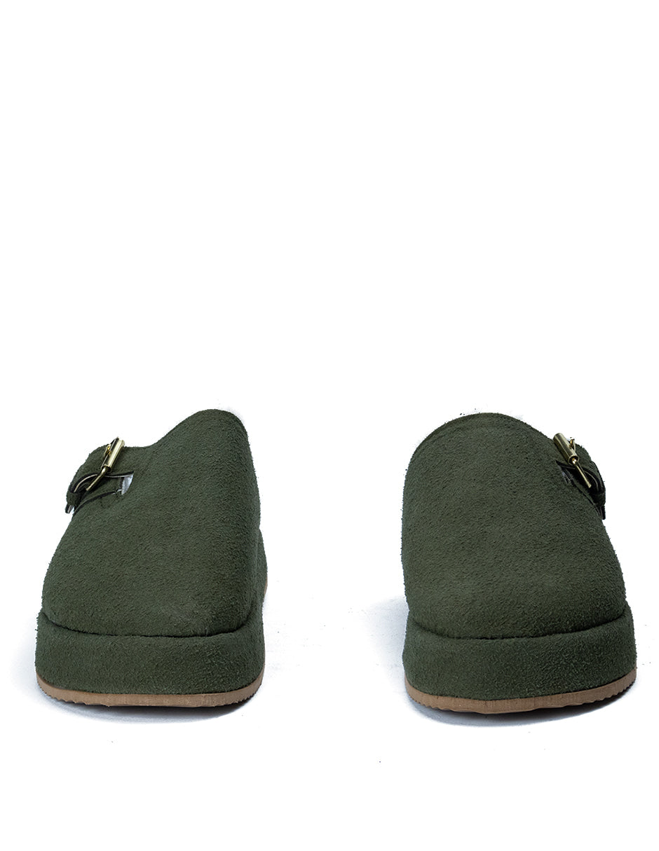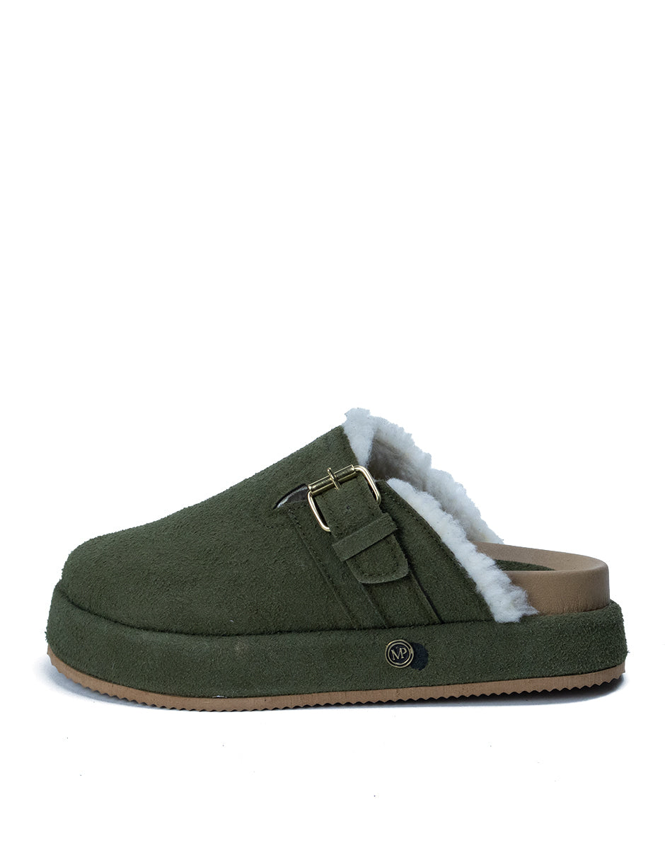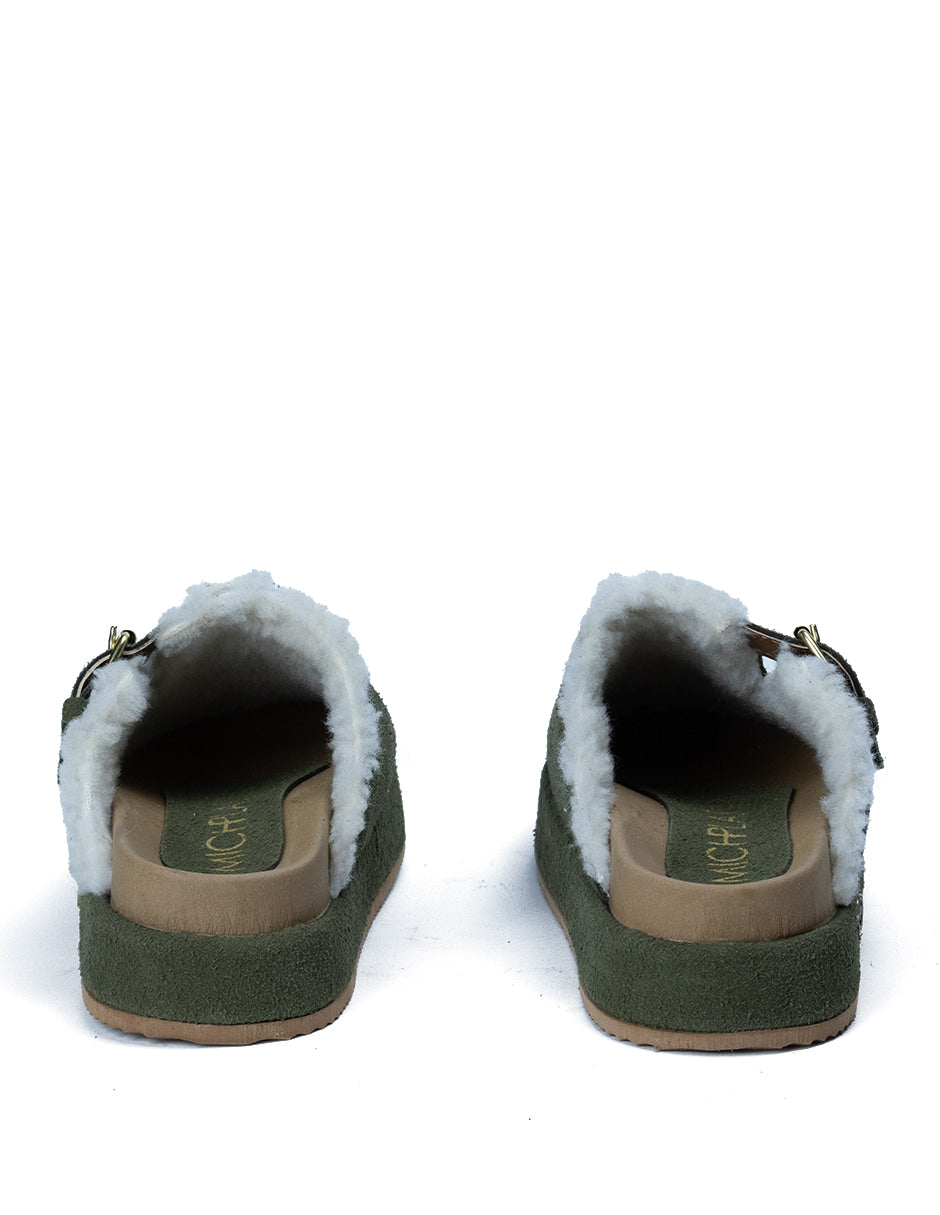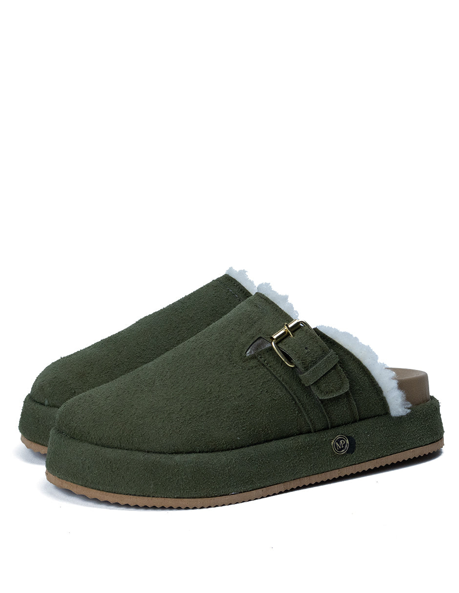 Zueco para Mujer con Forro Borrego, Fajo Ajustable Carnaza Color Verde Olivo