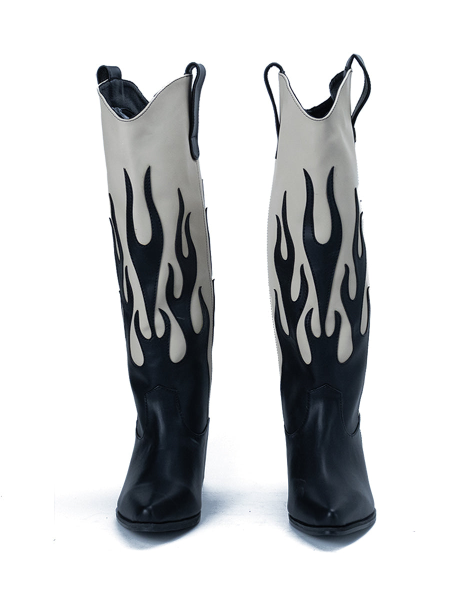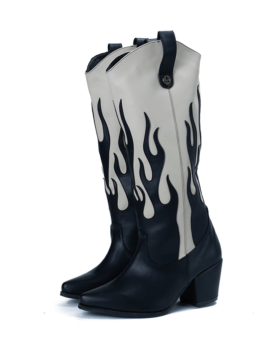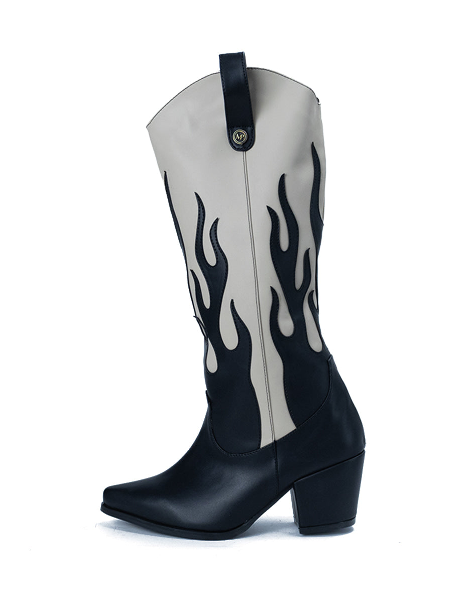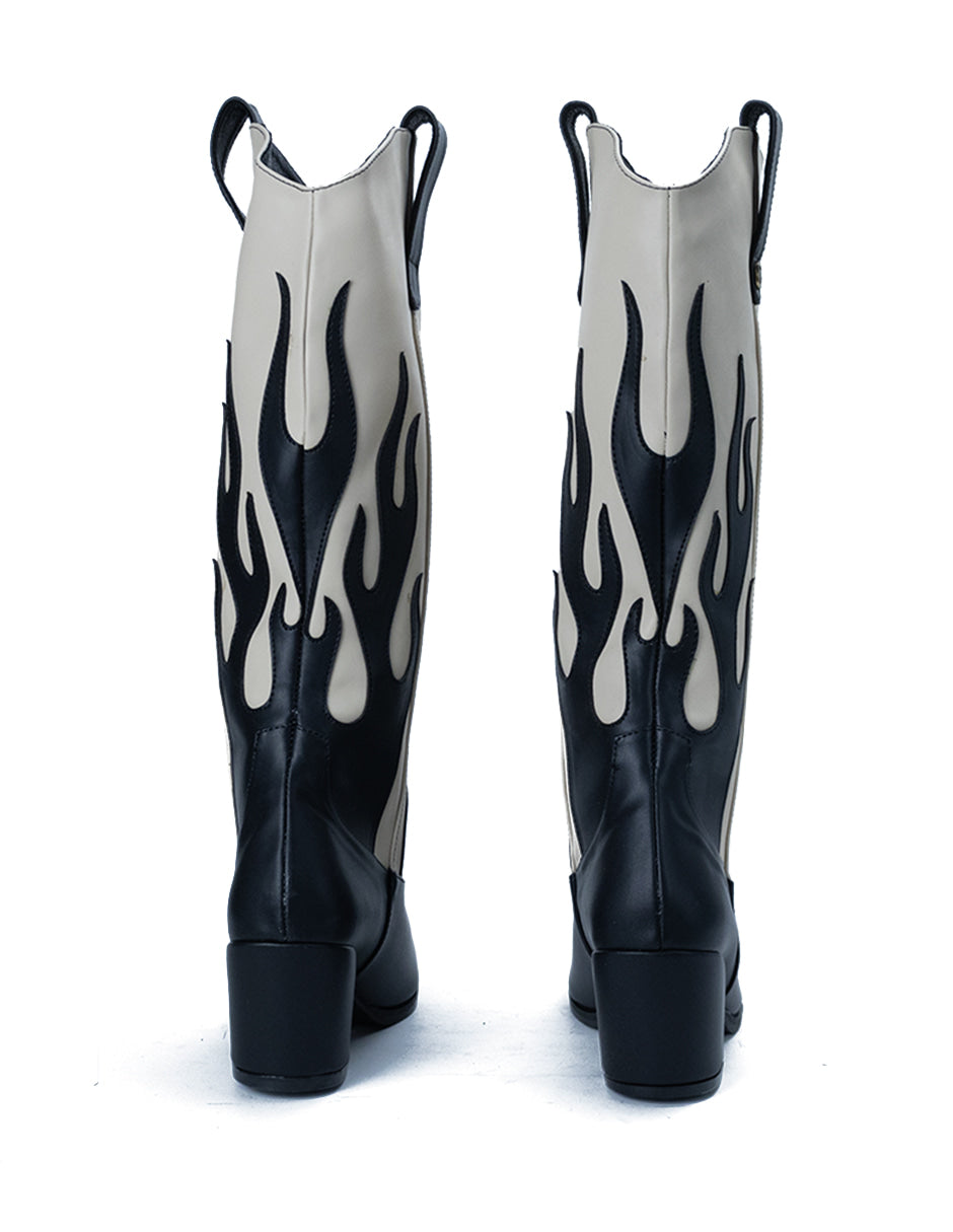 Estilo que Marca la Diferencia Bota sintética diseño bordado de flamas y tacón de baquetilla