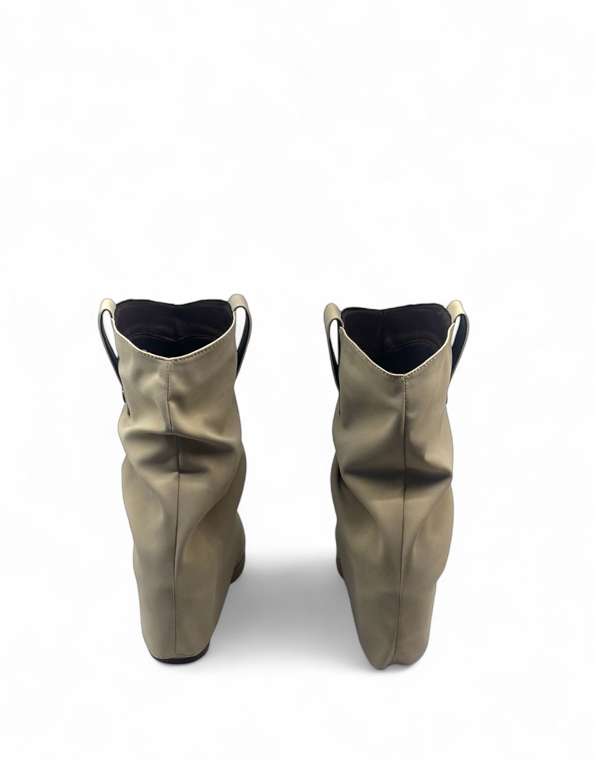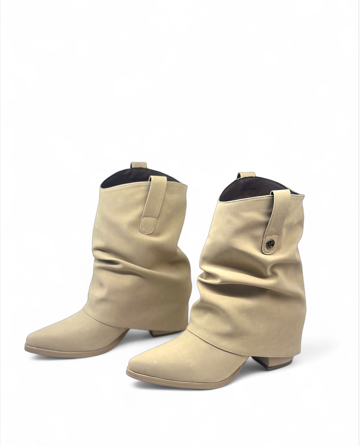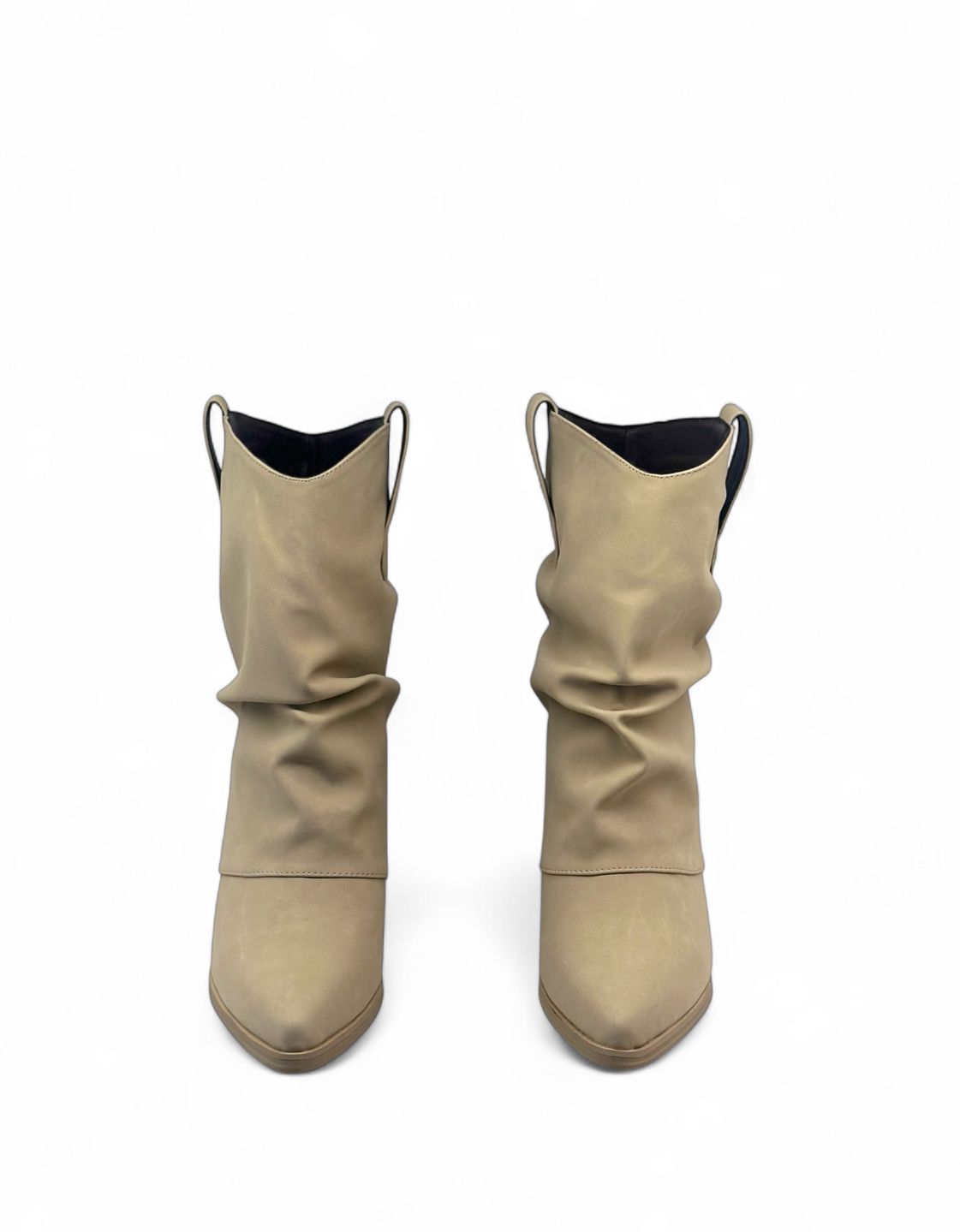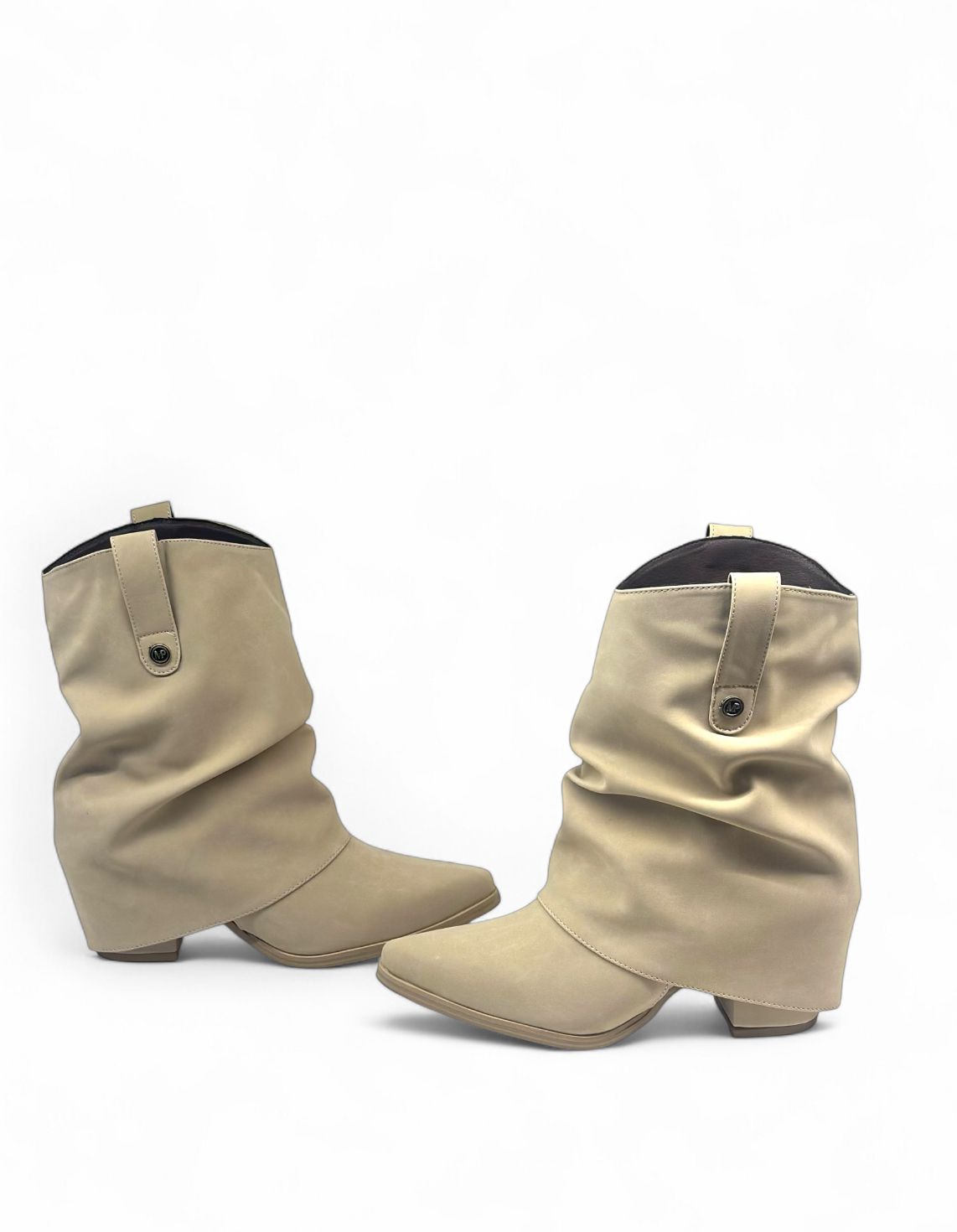La caña del botín es de altura media de 27 cm, llegando aproximadamente a la mitad de la pantorrilla, y muestra un efecto arrugado o 'slouchy', lo que le da un aspecto casual pero a la vez chic. La parte superior de la caña tiene un corte ligeramente curvado o en 'V' en la parte delantera y trasera, típico del estilo vaquero, lo que facilita el calce y añade un toque distintivo.