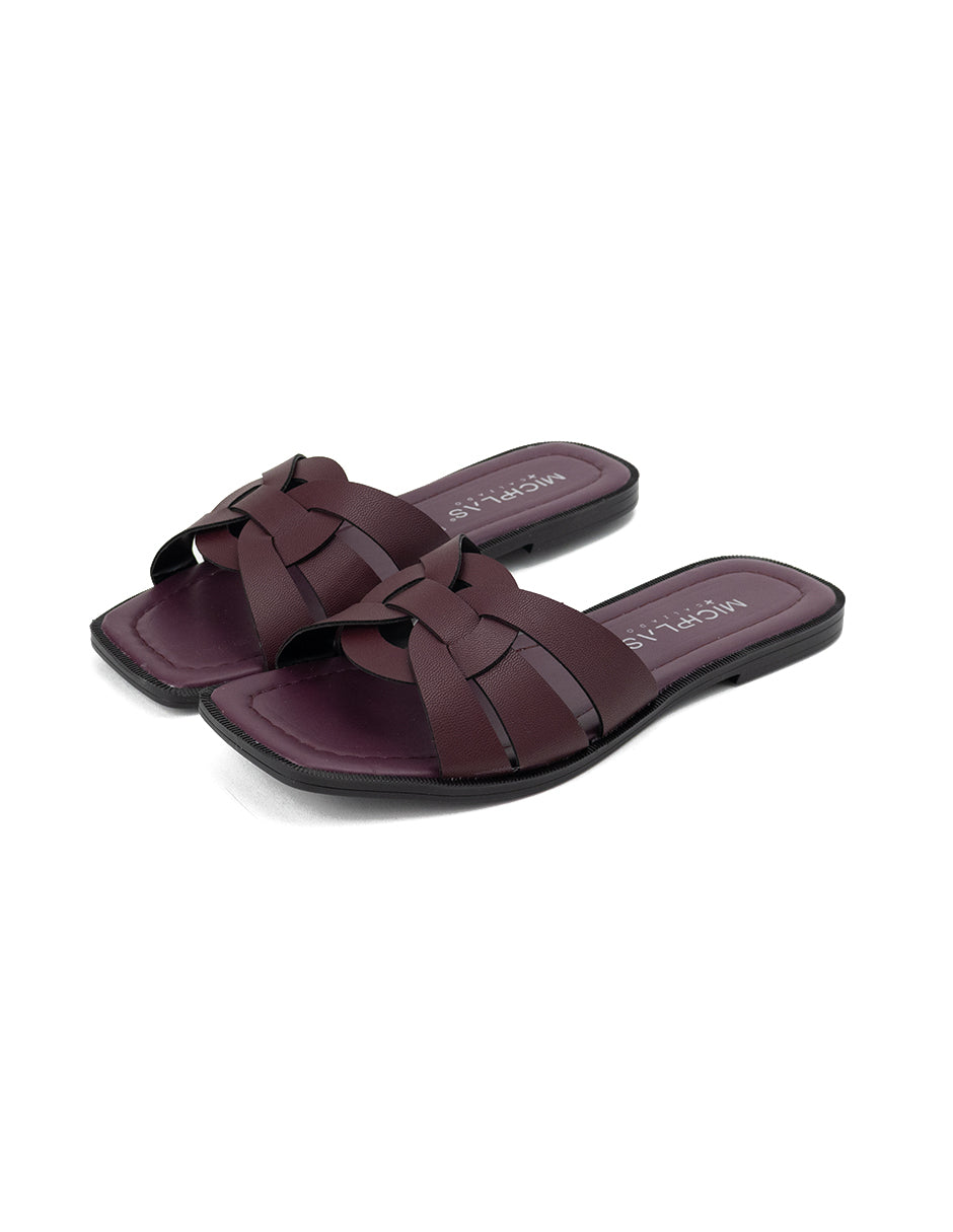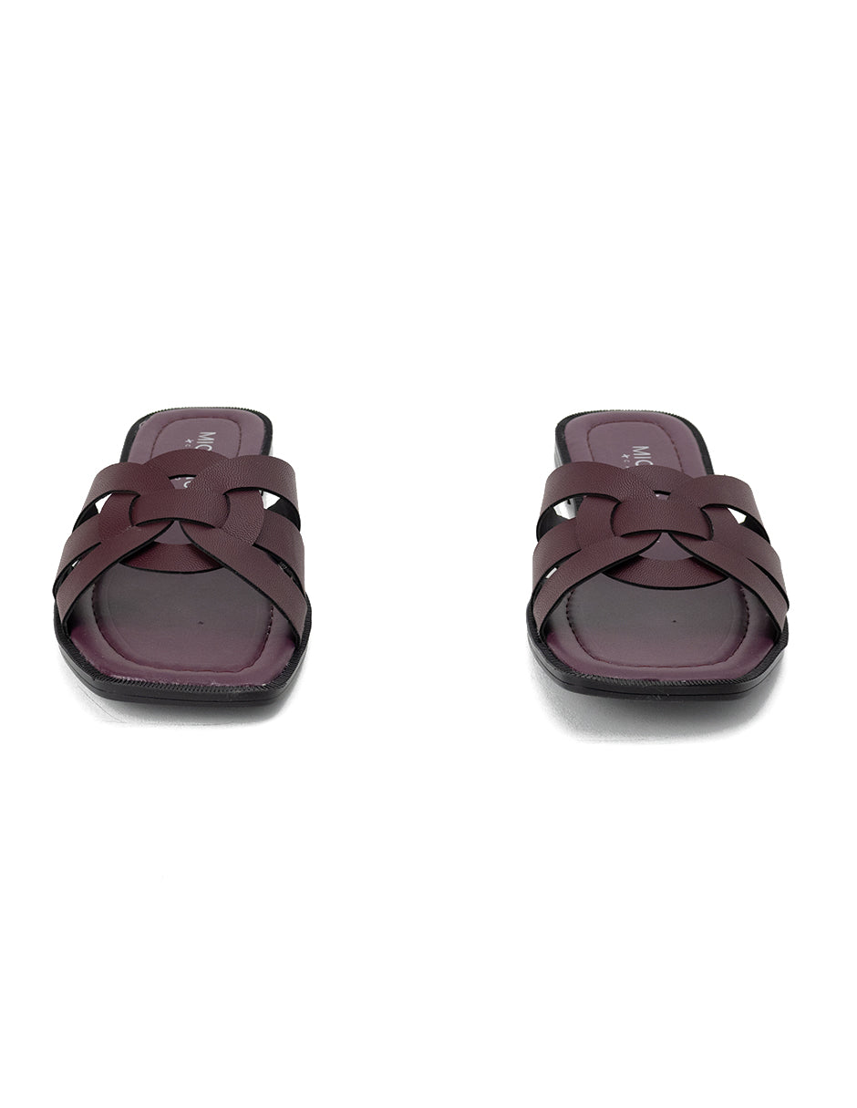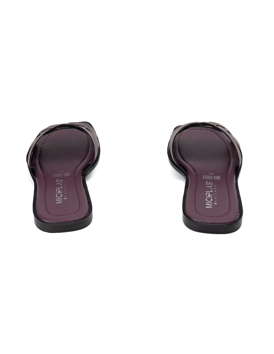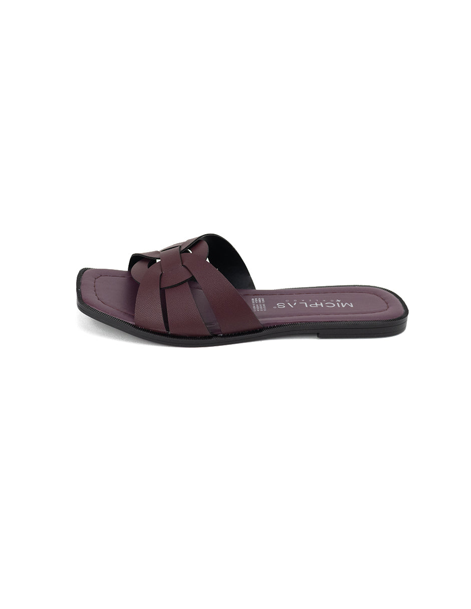 La sandalia es de diseño plano y color tinto, con una altura de 1cm., ideal para uso casual o veraniego. La suela tiene forma rectangular con bordes suavemente redondeados y costuras visibles alrededor de los extremos, lo cual le da un toque artesanal y robustez visual. La suela está diseñada para ser delgada pero cómoda, proporcionando un equilibrio entre estilo y practicidad.