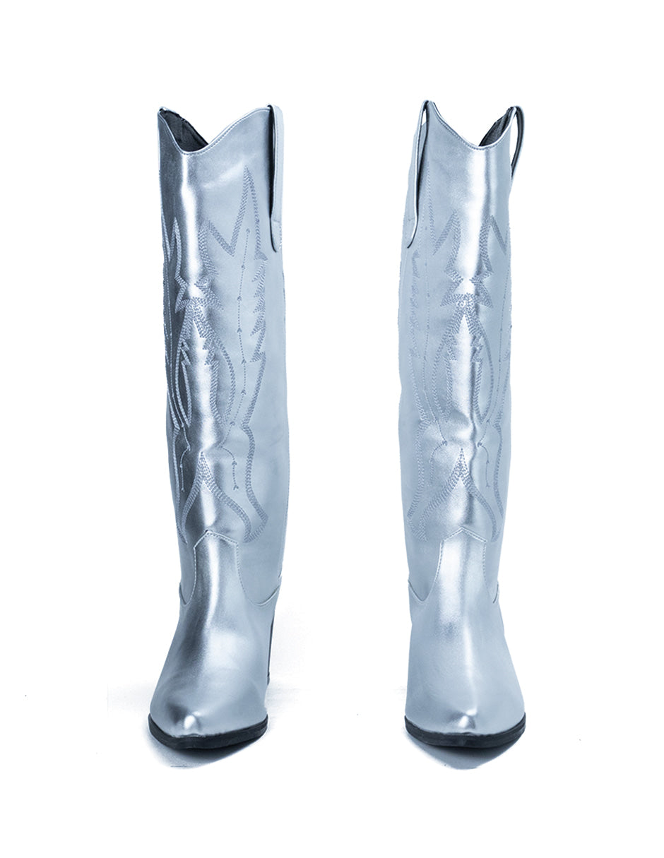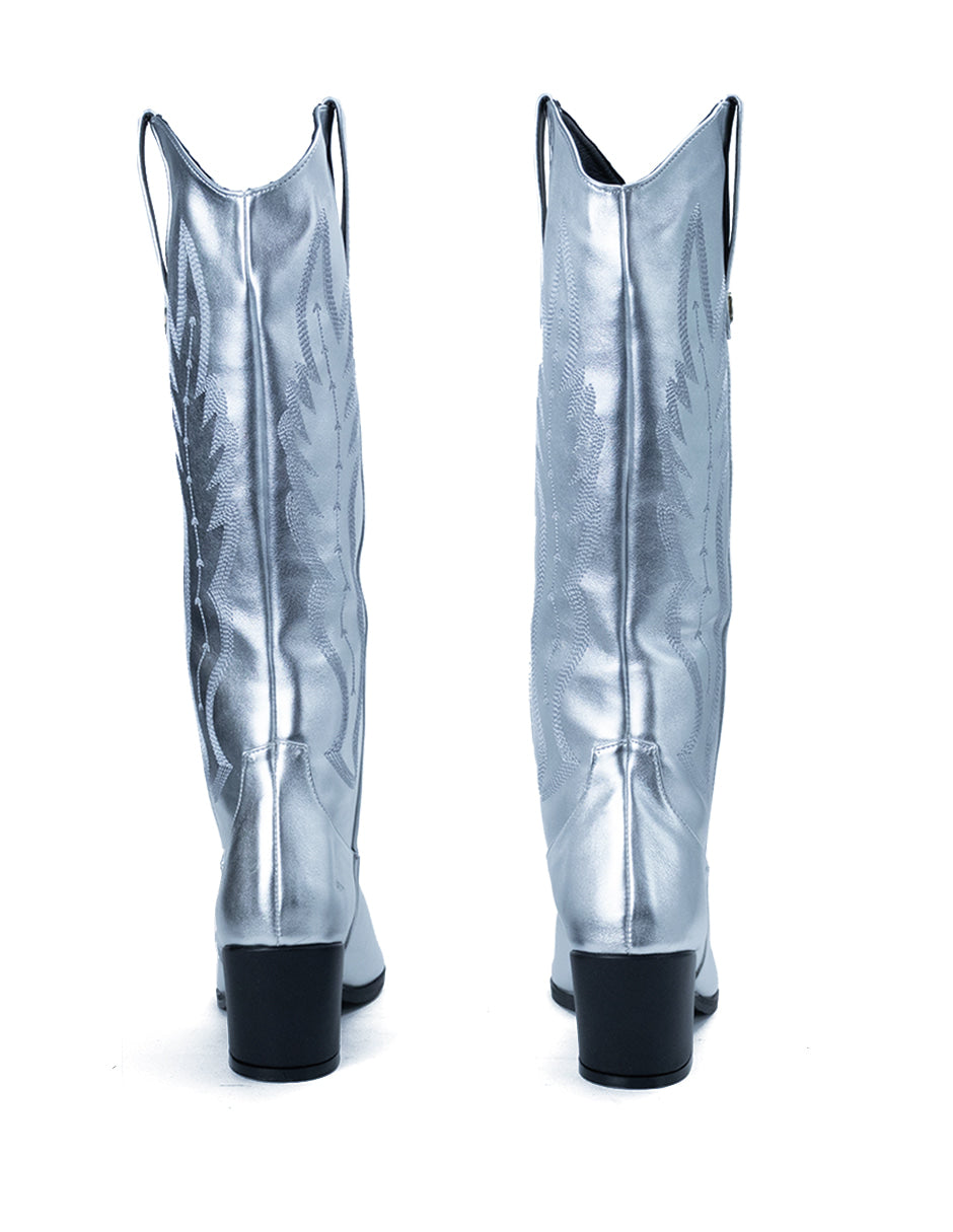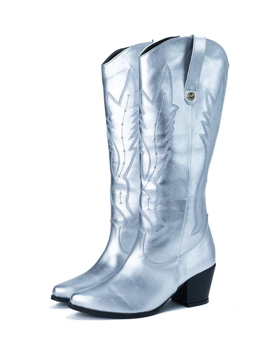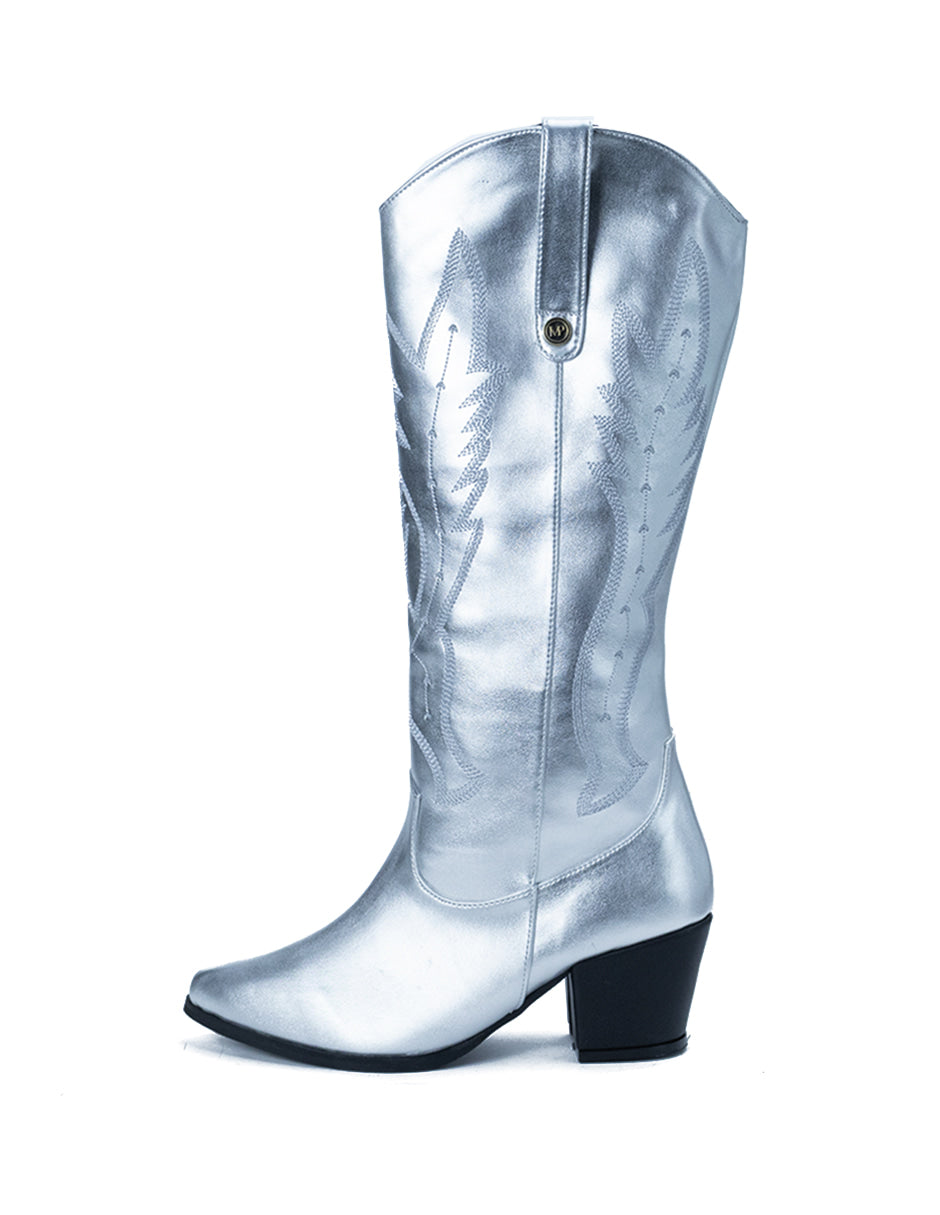 Bota para Mujer Sintética Bordada Vaquera Color Plateado Metálico