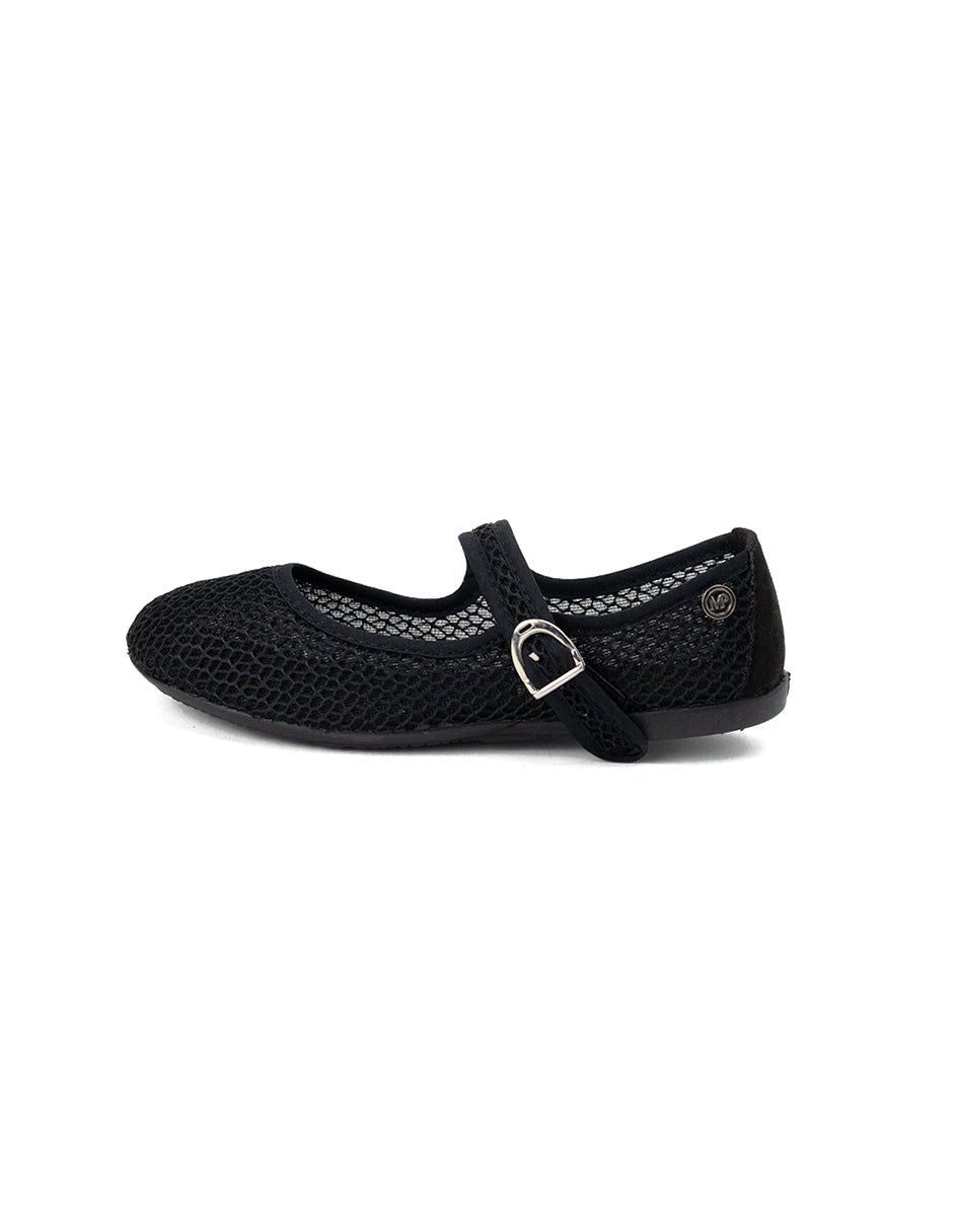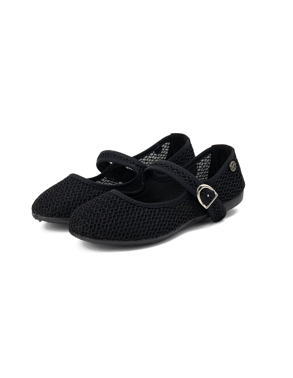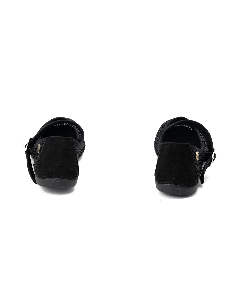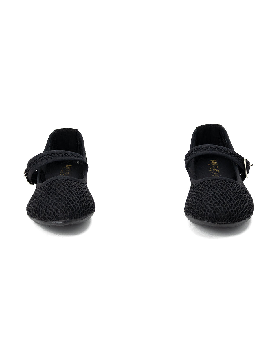 Este zapato es un estilo tipo balerina, elegante y funcional. Está confeccionado en un material de malla negra, lo cual le otorga un diseño aireado que permite la ventilación de los pies. La malla tiene un patrón que simula un tejido intrincado, añadiendo un toque sofisticado al zapato.