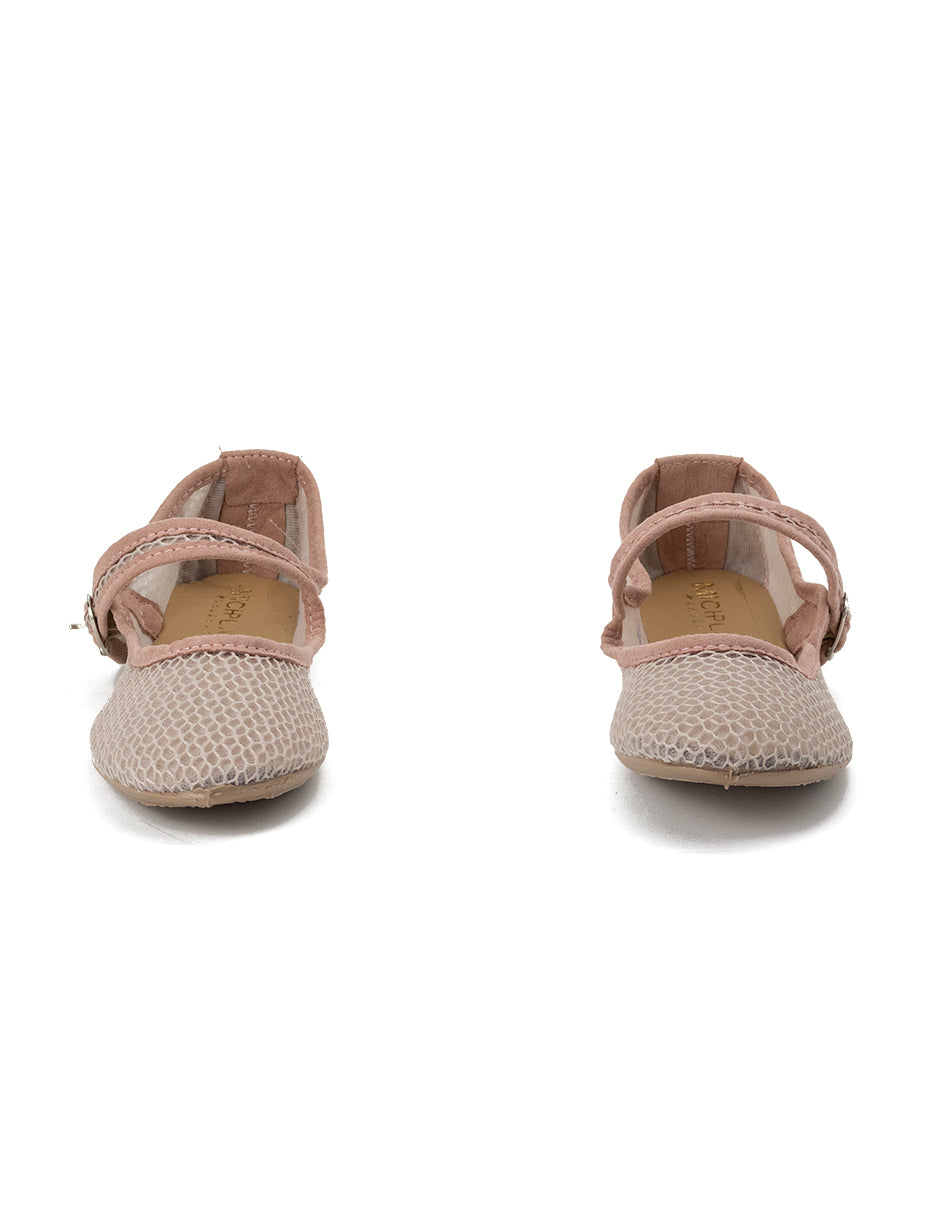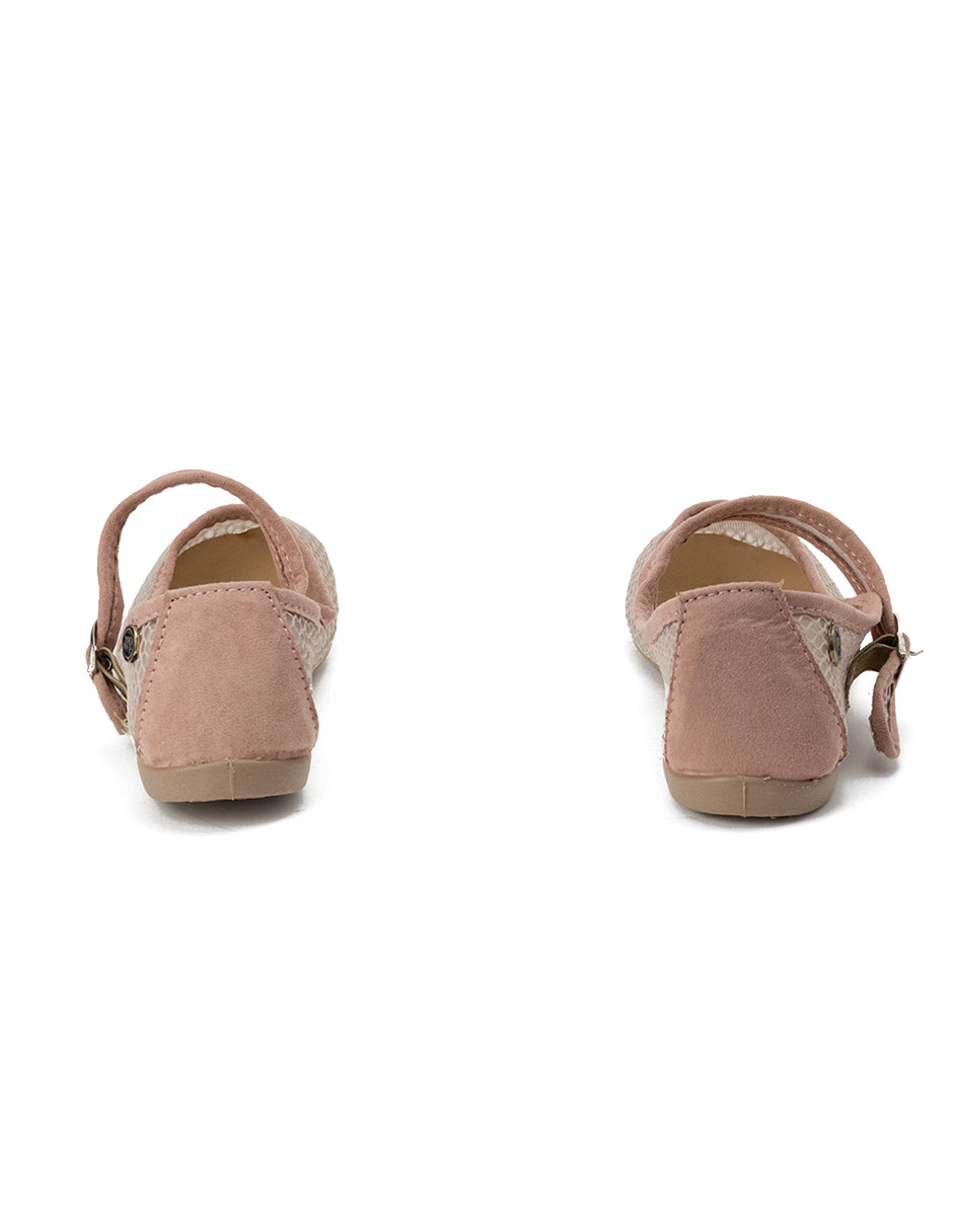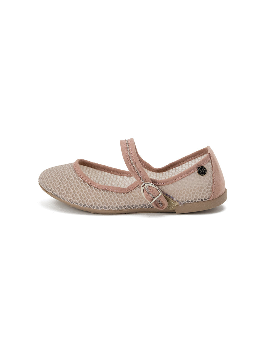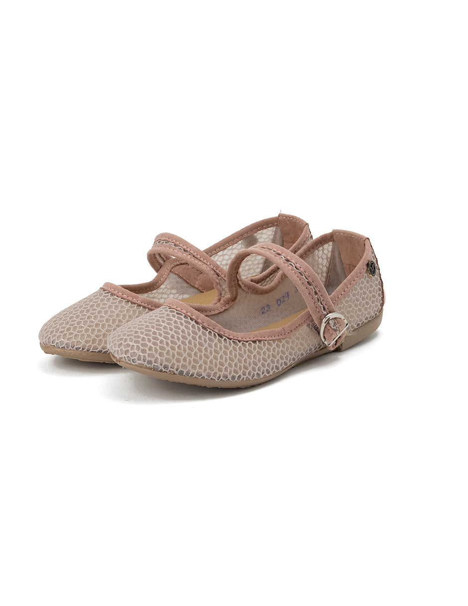 Este zapato es un estilo tipo balerina, elegante y funcional. Está confeccionado en un material de malla rosa, lo cual le otorga un diseño aireado que permite la ventilación de los pies. La malla tiene un patrón que simula un tejido intrincado, añadiendo un toque sofisticado al zapato.
